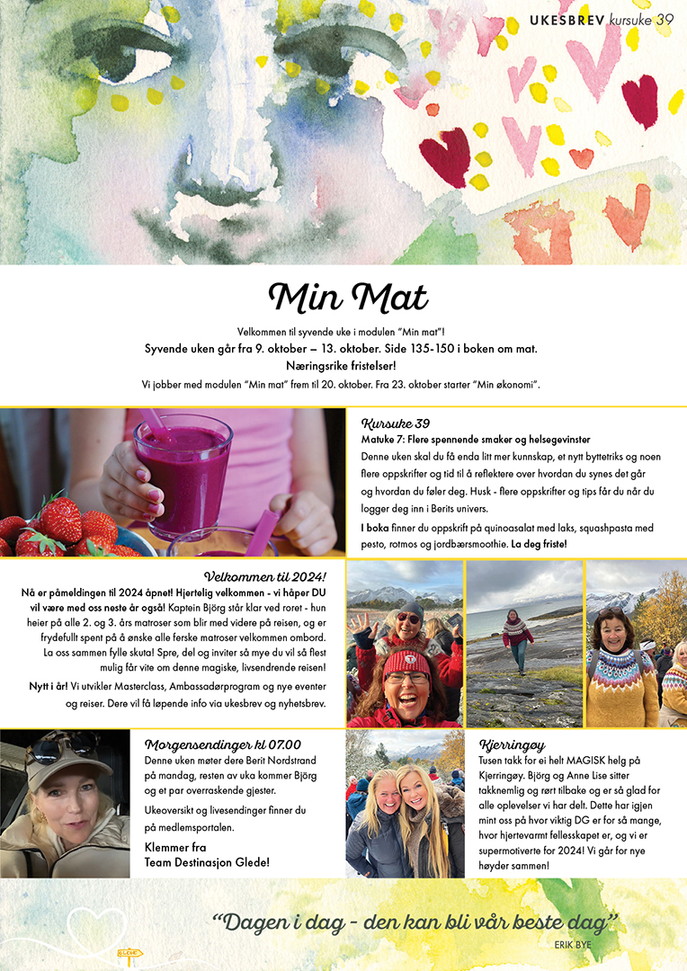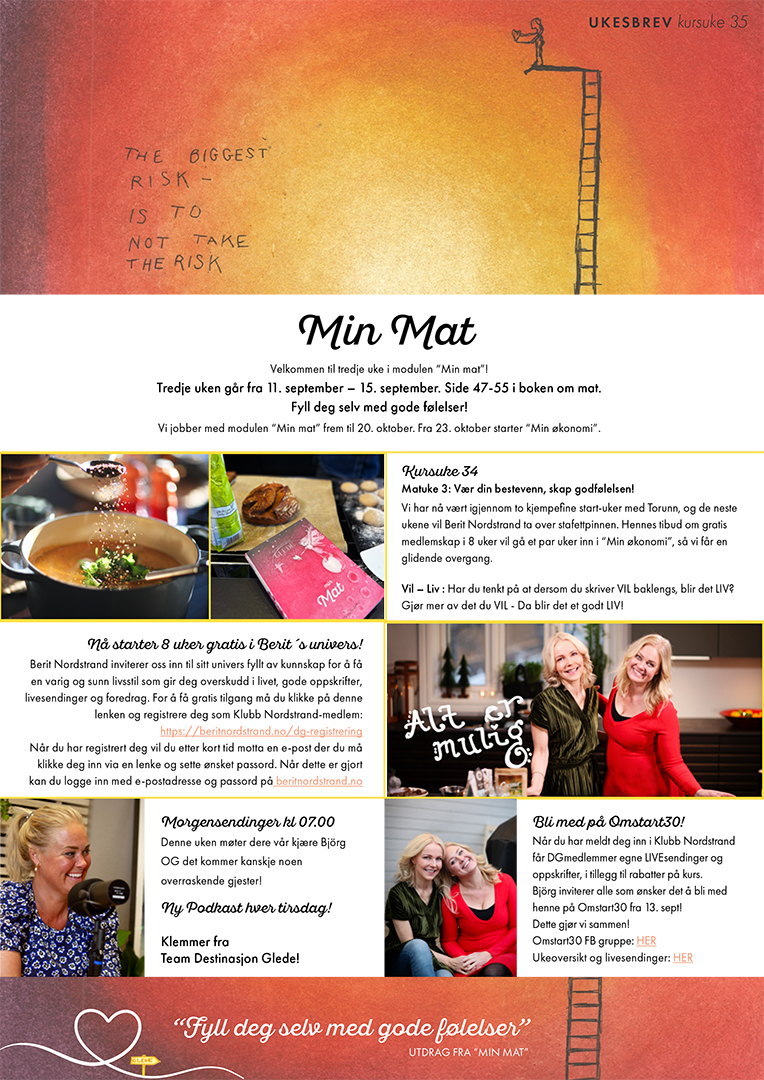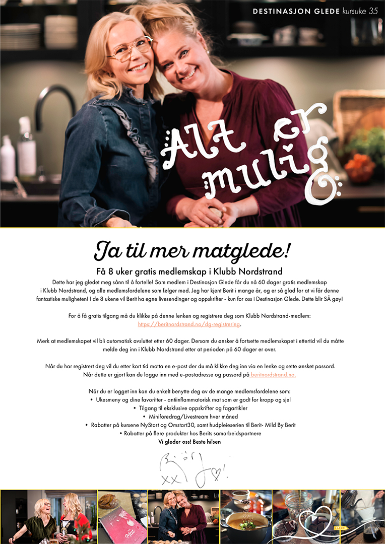 Vi håper så mange som mulig har registrert seg for åtte uker gratis i Berits univers for flere oppskrifter og mer inspirasjon: https://beritnordstrand.no/dg-registrering