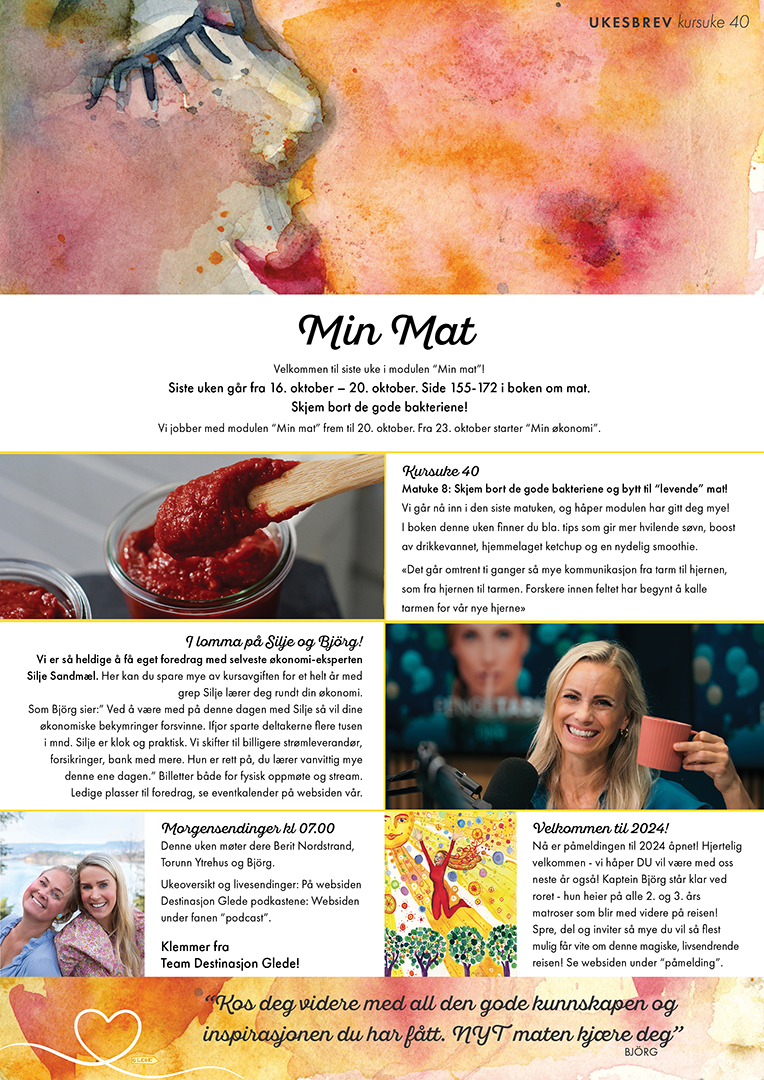 Vi går nå inn i den siste matuken, og håper modulen har gitt deg mye! I boken denne uken finner du bla. tips som gir mer hvilende søvn, boost av drikkevannet, hjemmelaget ketchup og en nydelig smoothie.