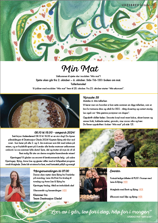Kjerringøy! Vi gleder oss enormt til førstkommende helg – på vakre Kjerringøy. Björg, Anne Lise og gjester stiller med et fullspekket program rundt Matglede. Dette blir et minne for livet, med fantastisk påfyll og energi!